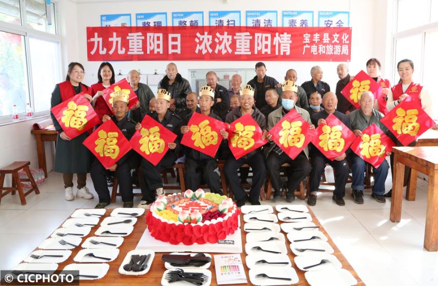 ↑2021年10月13日,河南省宝丰县文化广电和旅游局同宝丰县图书馆的文化志愿者来到石桥镇敬老院举办重阳节活动,并合影留念。CICPHOTO/王双正 摄