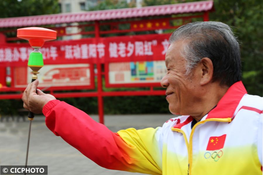 ↑2021年10月14日,河南省平顶山市宝丰县铁路办事处铁北社区的老人在重阳节活动中抖空竹。CICPHOTO/王双正 摄