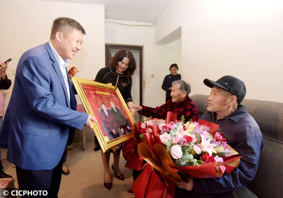 ↑2021年10月13日,江苏省徐州市泉山区桃园街道举办“情系最美夕阳”重阳节活动,工作人员为张小楼社区九旬老人杜长标、赵秀兰夫妇送上鲜花和白金婚纪念照。CICPHOTO/孙井贤 摄