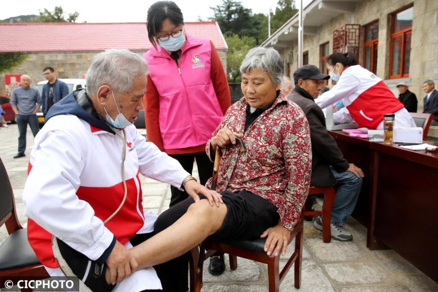↑2021年10月12日,江苏省连云港市连云区妇女联合与区红十字会在宿城街道留云岭村开展“学史力行办实事 情暖重阳敬老情”关爱活动。CICPHOTO/朱华南 摄
