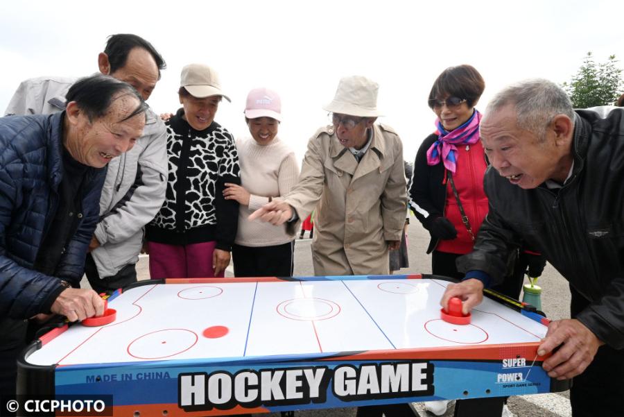 ↑2021年10月11日,在河北省邯郸市峰峰矿区上官庄湿地公园举办的重阳节活动中,老年人在进行桌上冰球游戏。CICPHOTO/郝群英 摄