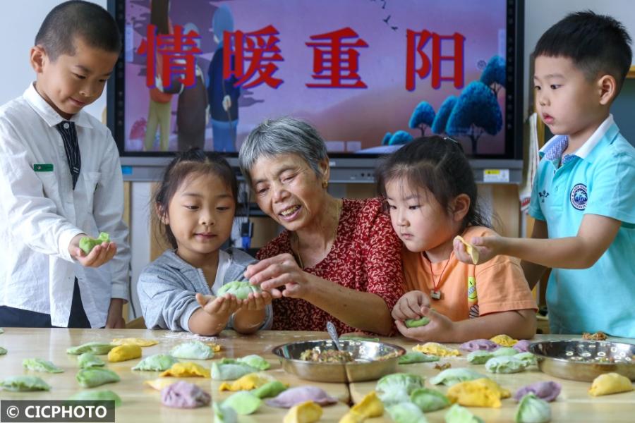 ↑2021年10月12日,在浙江省湖州市长兴县雉城幼儿园举办的重阳节活动中,孩子们在奶奶的指导下包多彩饺子。CICPHOTO/许斌华 摄