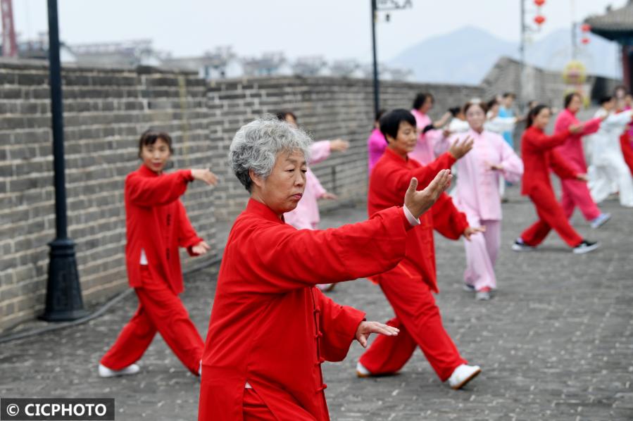 ↑2021年10月14日,河北省张家口市宣化区老年太极拳爱好者在古城墙上打太极拳,以登高健身的方式过重阳节。CICPHOTO/陈晓东 摄