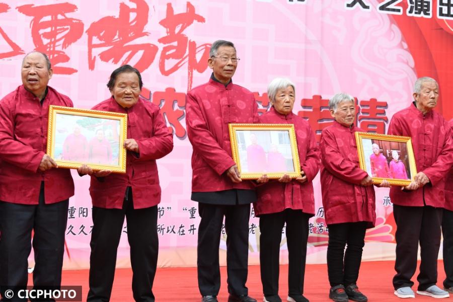 ↑2021年10月11日,在河北省邯郸市广平县广平镇侯固寨村举办的“九九重阳节 浓浓敬老情”活动中,村委会为老人送上金婚纪念照。CICPHOTO/程学虎 摄