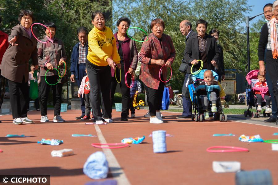 ↑2021年10月13日,在河北省邯郸市邯山区盛和路街道美和社区举行的重阳节活动中,老人们在参加趣味运动会。CICPHOTO/李昊 摄