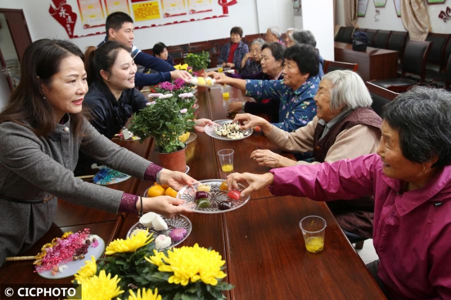 ↑2021年10月13日,在江苏省连云港市连云区墟沟街道桃园社区举办的重阳节活动中,工作人员给老人敬上重阳糕。CICPHOTO/朱华南 摄