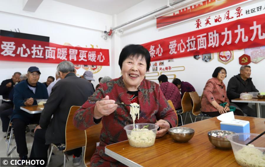↑2021年10月11日,山东省荣成市崖头街道新庄社区暖心食堂,老人在品尝“连心面”。近日,荣成市清真牛肉拉面联盟的30多家成员店工作人员自发到暖心食堂,为老人免费制作“连心面”。CICPHOTO/林海珍 摄