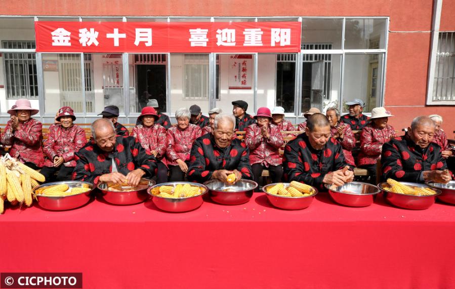 ↑2021年10月12日,山东省枣庄市孟庄镇大郭庄村老人在参加搓玉米比赛。该村是当地远近闻名的长寿村、敬老村,已连续11年为村里老年人集体过重阳节,今年有53名80岁以上的老年人穿着村里统一定制的唐装参加搓玉米、剥花生等趣味比赛。CICPHOTO/吉喆 摄