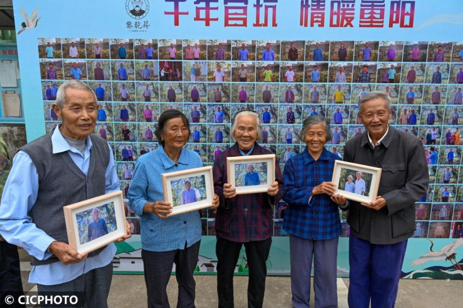 ↑2021年10月12日,江西省上饶市婺源县段莘乡官坑村老人手持自已的生活照在村口照片墙前留影。CICPHOTO/王国红 摄