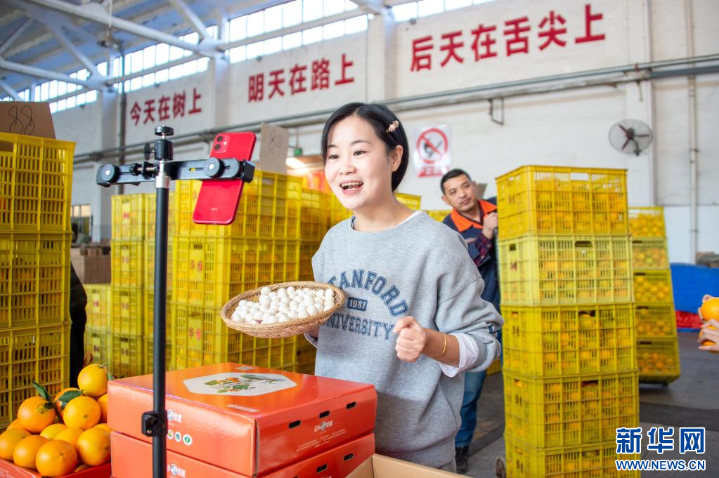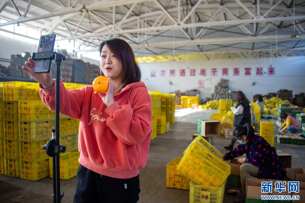 11月10日,在秭归县华维电商物流园区内,工作人员进行直播销售。 作为国家数字乡村试点地区,湖北省秭归县积极推进信息基础设施建设、智慧农业和乡村数字治理,将数字经济与传统农业产业融合发展,推出集智慧生产、智慧营销、智慧供应链于一体的科技农业示范基地及农业信息化综合应用平台,助力乡村振兴。 新华社发(伍志尊 摄)