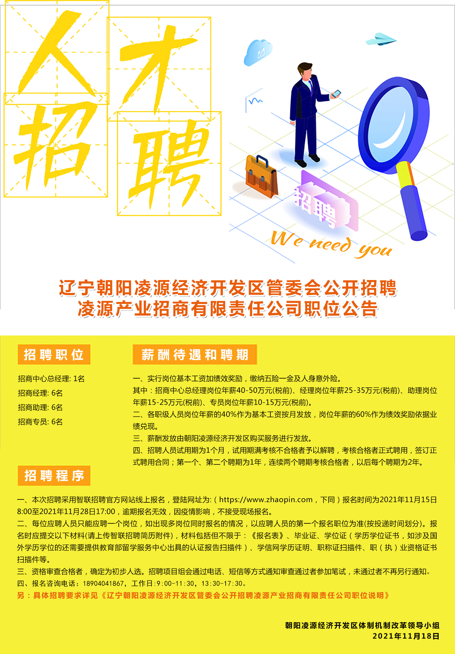 按照朝阳凌源经济开发区管委会(下文简称“开发区管委会”)开发运营机制改革的总体要求,本着公开、平等、竞争、择优的原则,凌源产业招商有限责任公司决定面向全国公开招聘新动能、装备制造、汽车制造及零部件、新型复合材料等领域招商精英人士,现就有关事项公告如下: