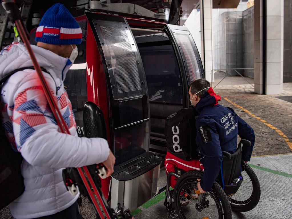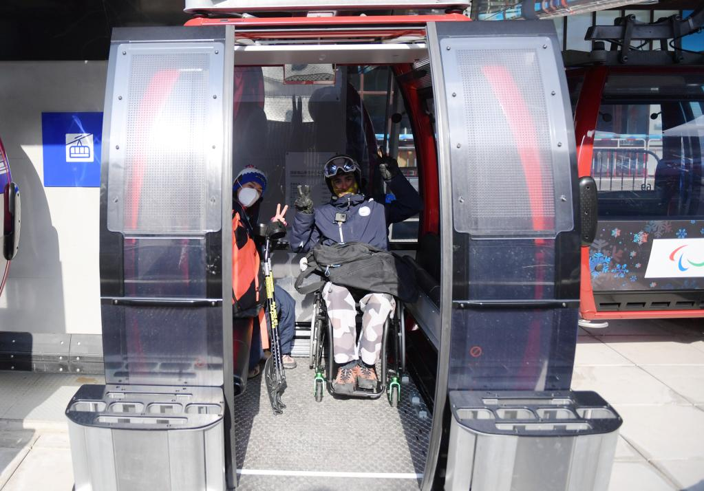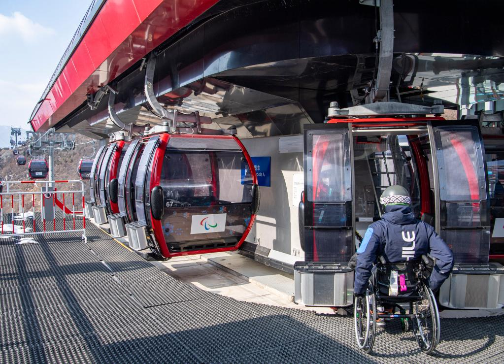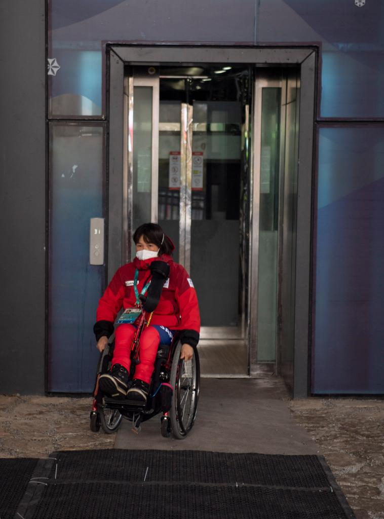 2月28日,在国家高山滑雪中心,一名运动员乘坐轮椅驶出无障碍电梯。