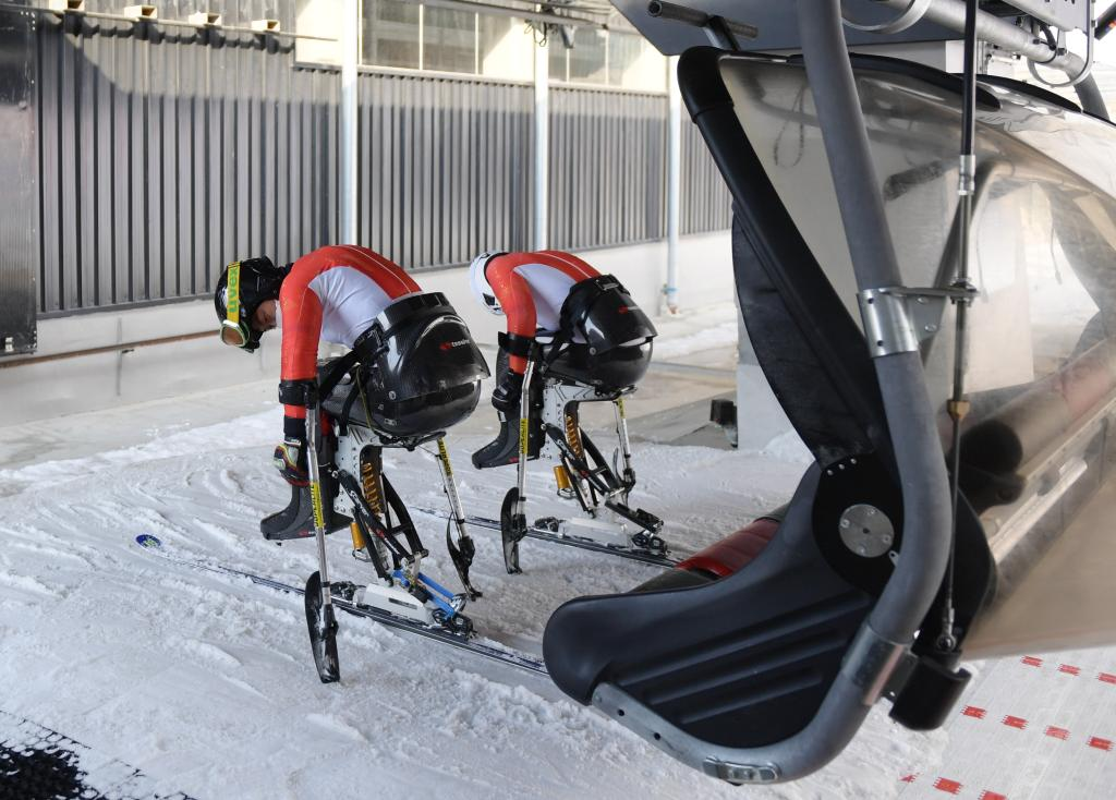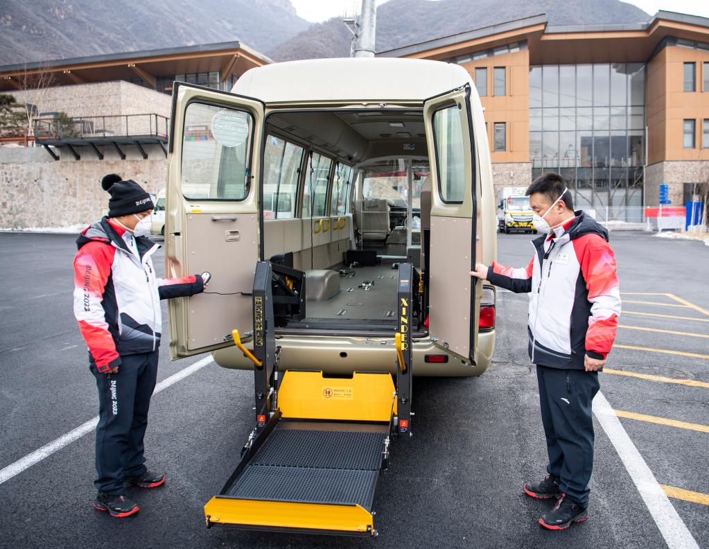 2月28日,工作人员在国家高山滑雪中心展示场馆内的无障碍车辆。