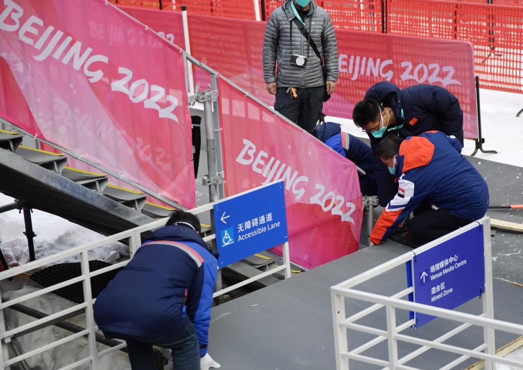2月28日,工作人员在国家高山滑雪中心修整无障碍通道。