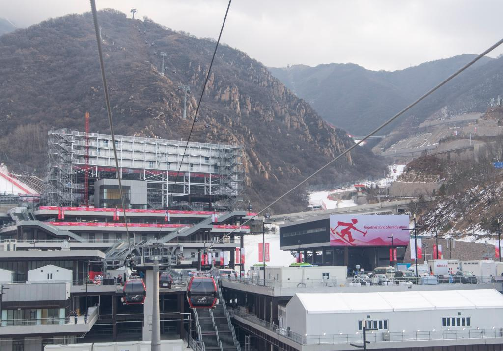 2月28日,运动员在国家高山滑雪中心乘坐缆车。