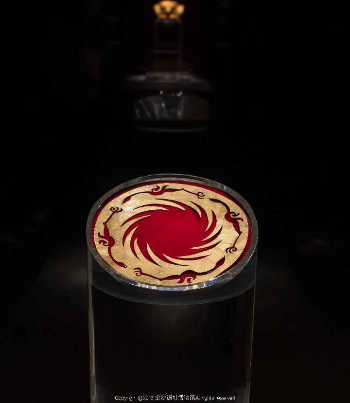 太阳神鸟金饰内层图案是向四周喷射出十二道光芒的太阳,动感十足,外层四只展翅的神鸟围绕着太阳循环往复地飞翔。这件文物构图严谨、线条流畅、极富韵律,充满强烈的动感,与中国古代的“金乌负日”传说不谋而合,不仅体现了中国人对于光明的热爱,也彰显自由、美好、团结向上的寓意。