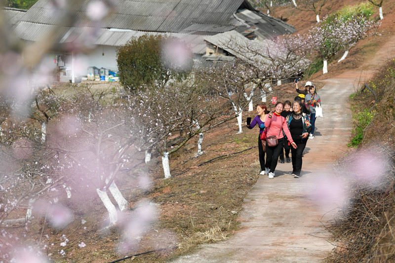 3月,重庆市九龙坡区西彭镇长安村花果山上的桃花盛开了,周边游客纷至沓来,在花丛中拍照“打卡”。