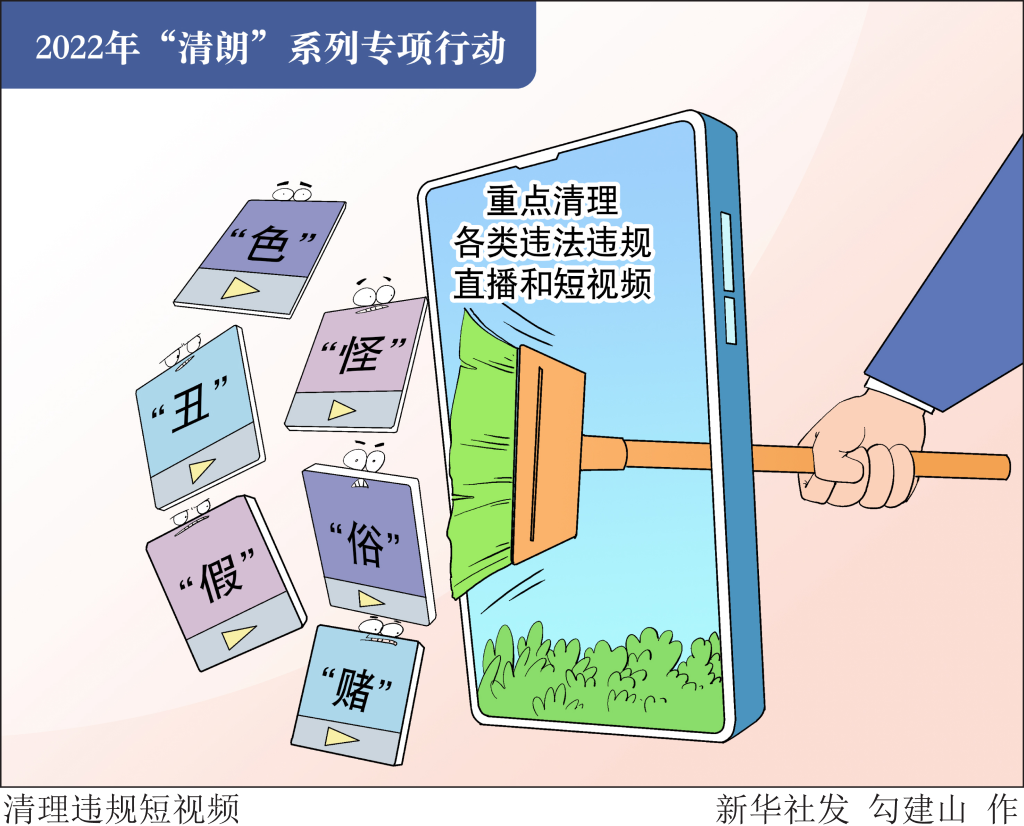 国家网信办有关负责人近日介绍,2022年“清朗”系列专项行动中,将重点清理“色、丑、怪、假、俗、赌”等各类违法违规的直播和短视频。