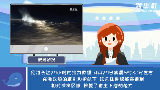 近日,一头抹香鲸在浙江省宁波市象山县附近海域搁浅,经过长达20小时的接力救援,4月20日凌晨5时30分左右,在渔政船的牵引和护航下,这头抹香鲸被拖拽到相对深水区域,恢复了自主下潜的能力。