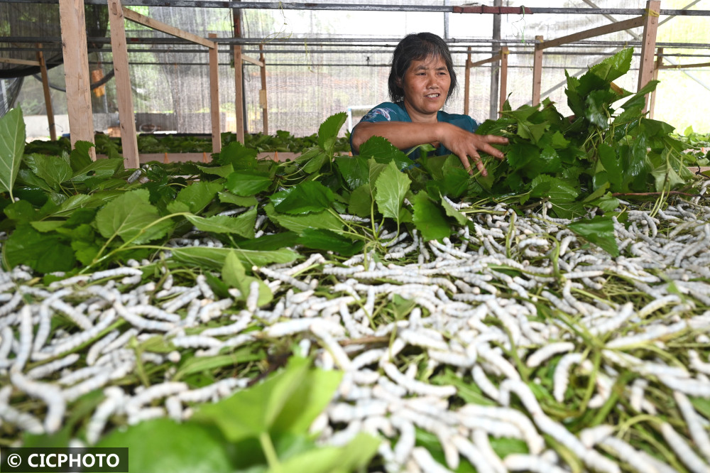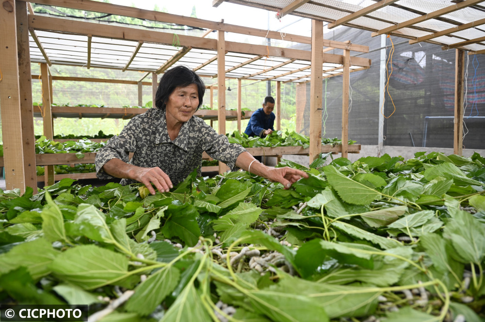 ↑2022年5月9日,在四川省内江市东兴区双桥镇双流村,蚕农在投喂桑叶。CICPHOTO/兰自涛 摄