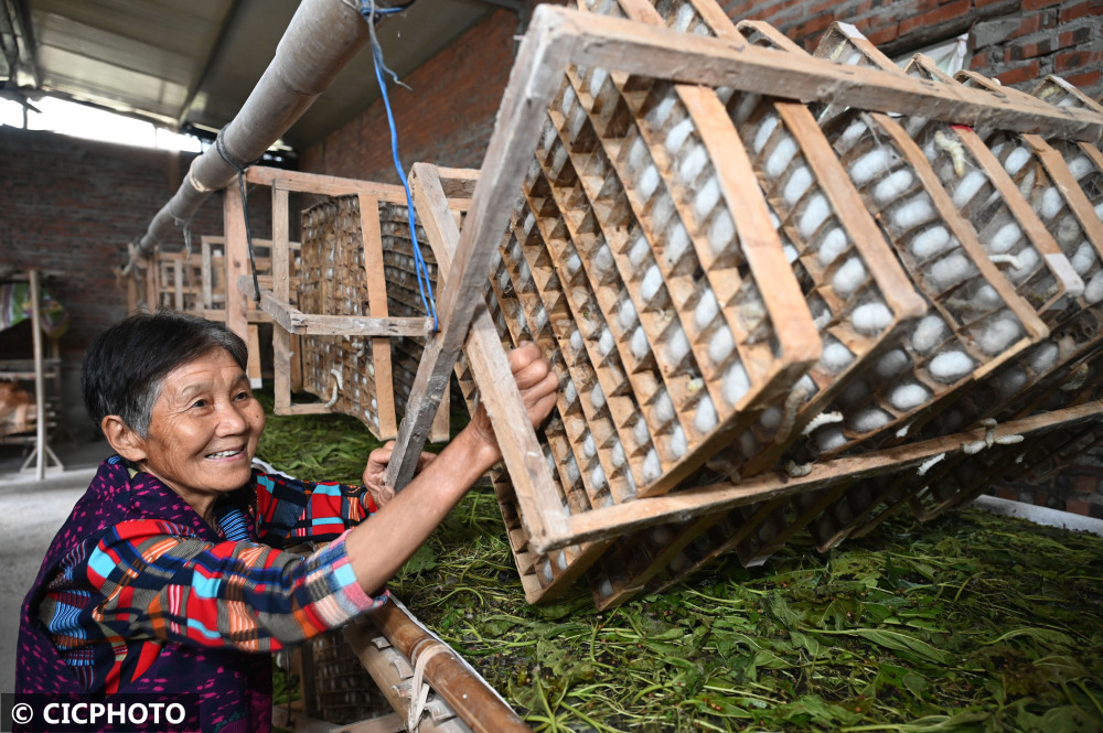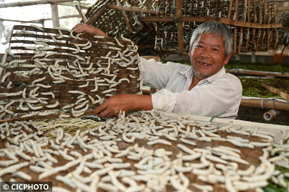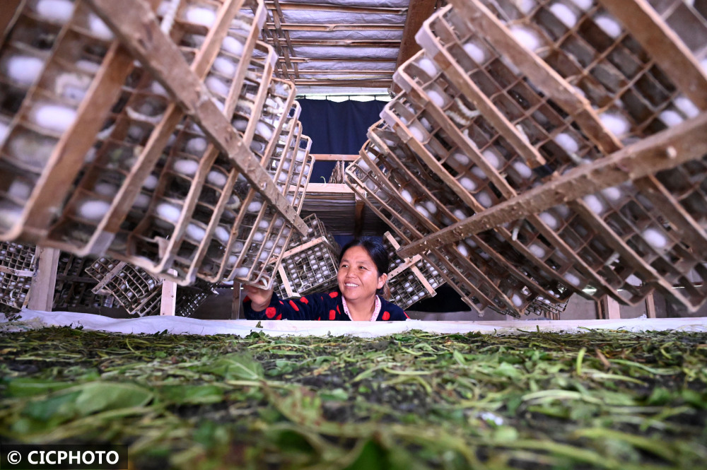 ↑2022年5月9日,在四川省内江市东兴区双才镇洪兴村,蚕农在蚕房里查看蚕虫上蔟吐丝结茧情况。CICPHOTO/兰自涛 摄