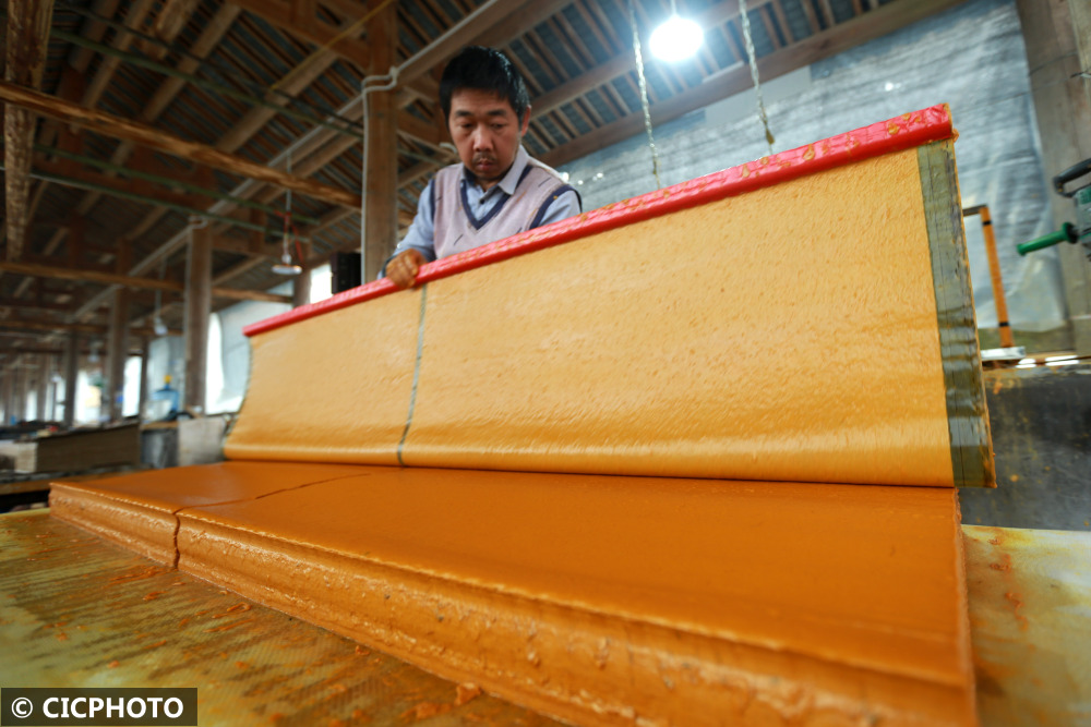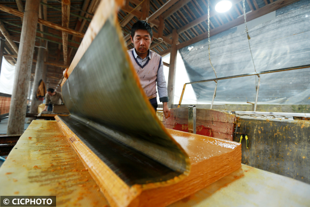 ↑2022年5月21日,在贵州省黔东南苗族侗族自治州丹寨县南皋乡石桥村古法造纸作坊,工人在抄制手工金粉纸。CICPHOTO/肖伟 摄