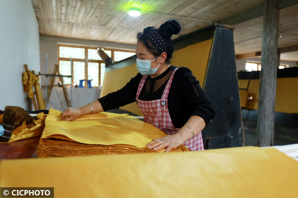 ↑2022年5月21日,在贵州省黔东南苗族侗族自治州丹寨县南皋乡石桥村古法造纸作坊,工人在整理手工金粉纸。CICPHOTO/肖伟 摄