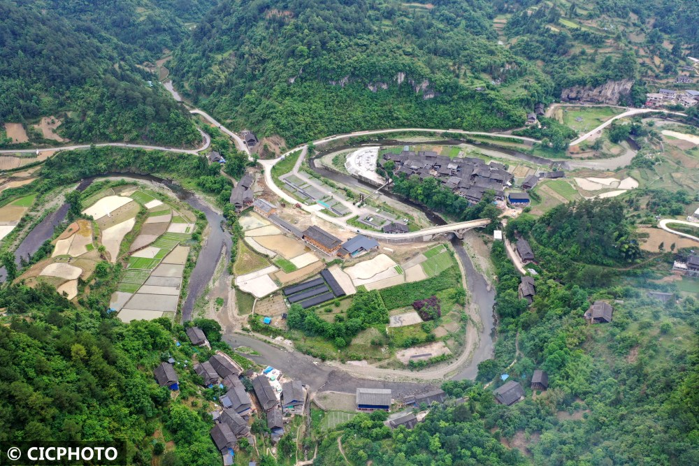 ↑2022年5月21日拍摄的贵州省黔东南苗族侗族自治州丹寨县南皋乡石桥村。(无人机照片)CICPHOTO/肖伟 摄