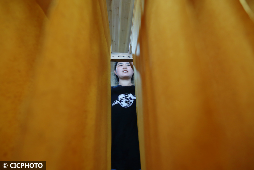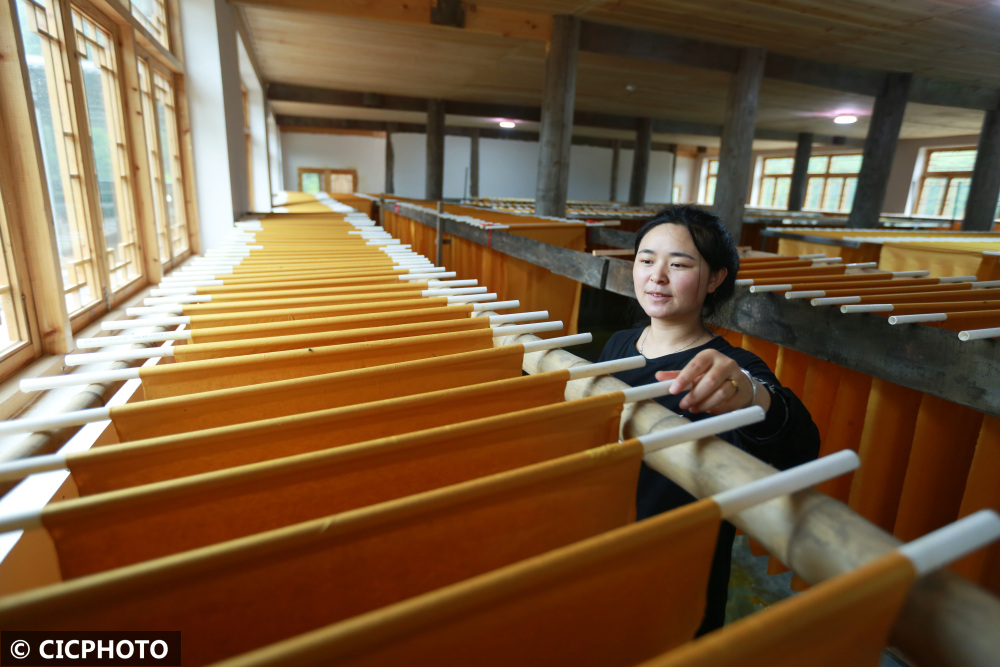 ↑2022年5月21日,在贵州省黔东南苗族侗族自治州丹寨县南皋乡石桥村古法造纸作坊,工人在晾晒手工金粉纸。CICPHOTO/肖伟 摄