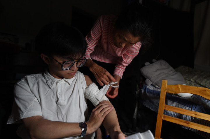 奶奶方桂兰(右)帮助张亮更换胳膊上的夹板。新华社记者 周牧 摄