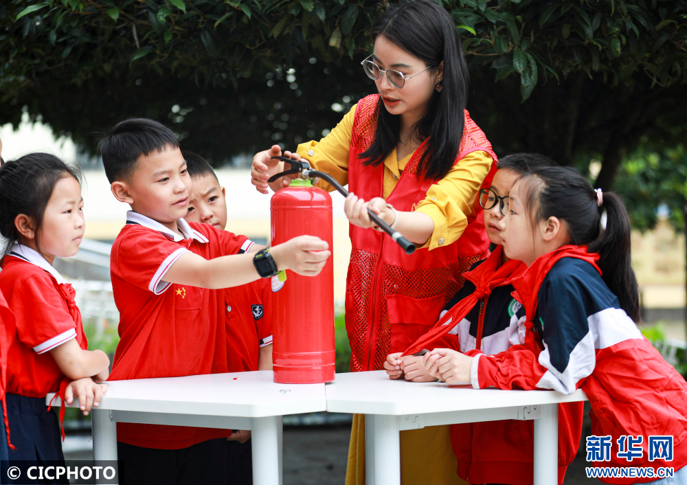 ↑2022年7月18日,在贵州省黔西市甘棠镇联新社区公益暑托班上,志愿者在指导孩子们使用灭火器。CICPHOTO/周训超 摄