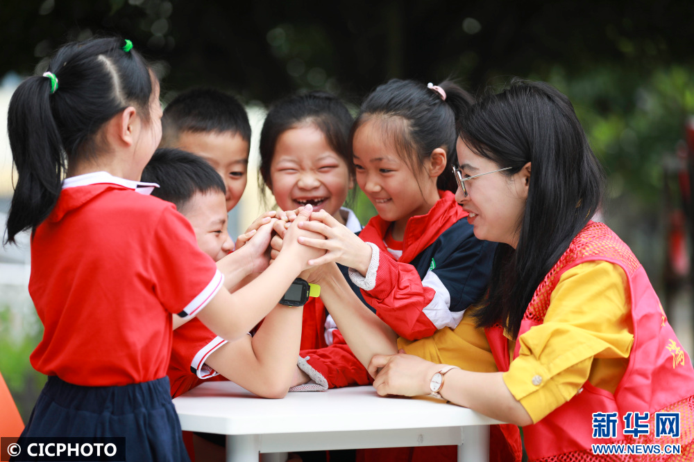 ↑2022年7月18日,在贵州省黔西市甘棠镇联新社区公益暑托班,志愿者和孩子们一起做掰手腕的游戏。CICPHOTO/周训超 摄