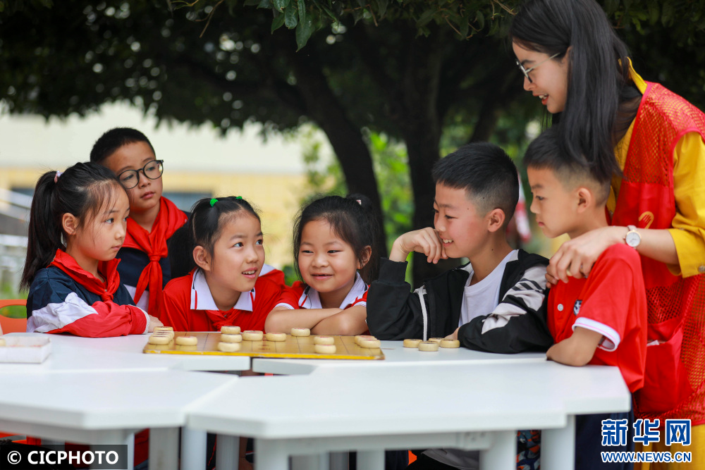 ↑2022年7月18日,在贵州省黔西市甘棠镇联新社区公益暑托班,志愿者在指导孩子们下象棋。CICPHOTO/周训超 摄