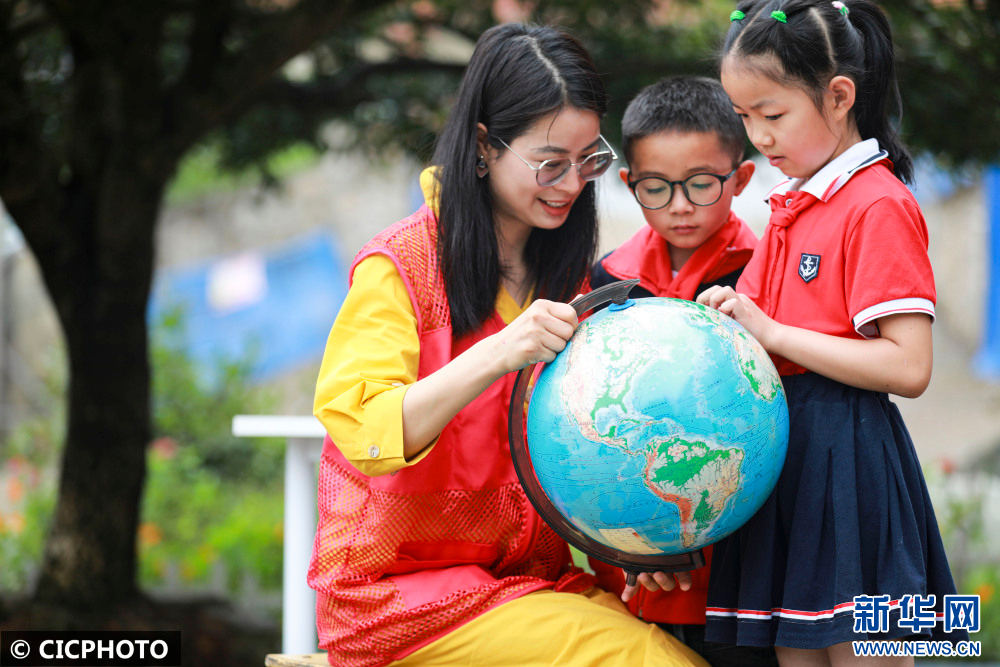↑2022年7月18日,在贵州省黔西市甘棠镇联新社区公益暑托班上,志愿者指导孩子们在地球仪上找家乡。CICPHOTO/周训超 摄
