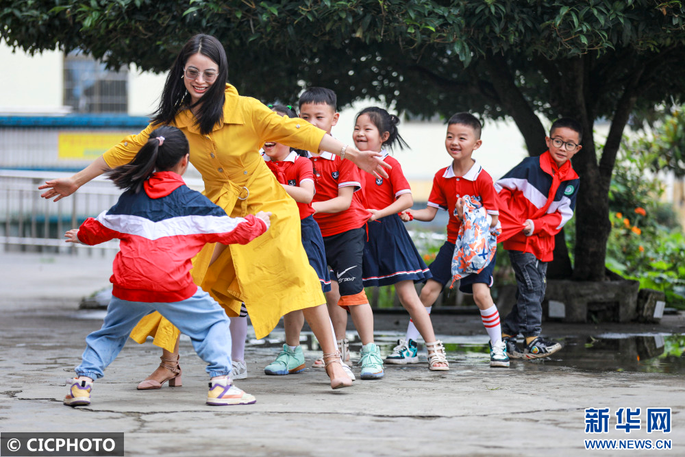 ↑2022年7月18日,在贵州省黔西市甘棠镇联新社区公益暑托班,志愿者和孩子们一起做老鹰捉小鸡的游戏。CICPHOTO/周训超 摄