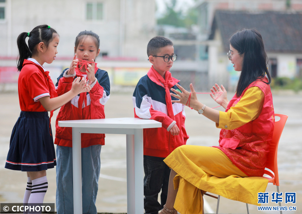 ↑2022年7月18日,在贵州省黔西市甘棠镇联新社区公益暑托班,志愿者和孩子们一起做翻花线的游戏。CICPHOTO/周训超 摄