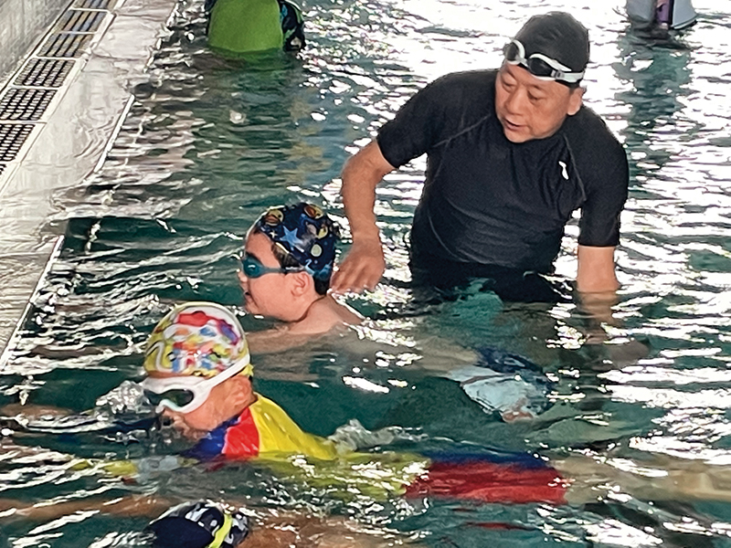 李际新组织孩子们游泳(2021年12月摄) 辽宁省本溪市平山区特殊教育学校供图