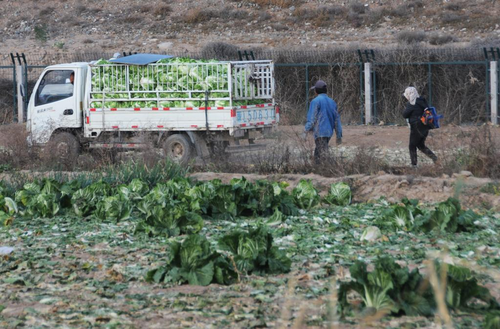 记者现场看到,五四村村道两侧分布着多块形状不一的菜地,农户们挥动镰刀收割白菜,绿油油的白菜装满车厢。五四村村民王乐书说:“1亩地产2500多棵白菜,每棵白菜三四公斤重,直接运送到了我们当地农贸市场、超市,销售比较畅通。”