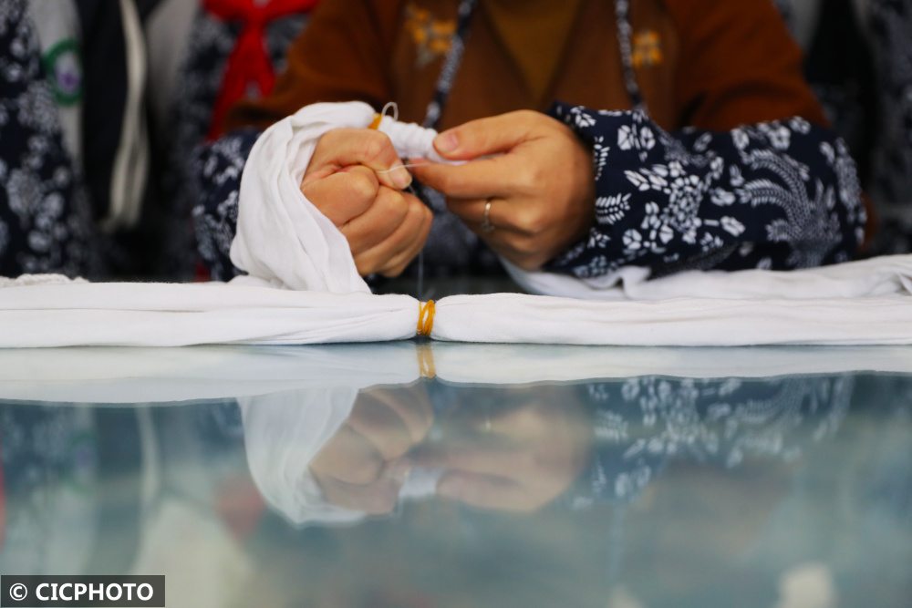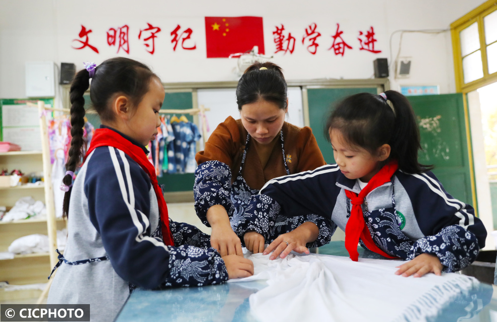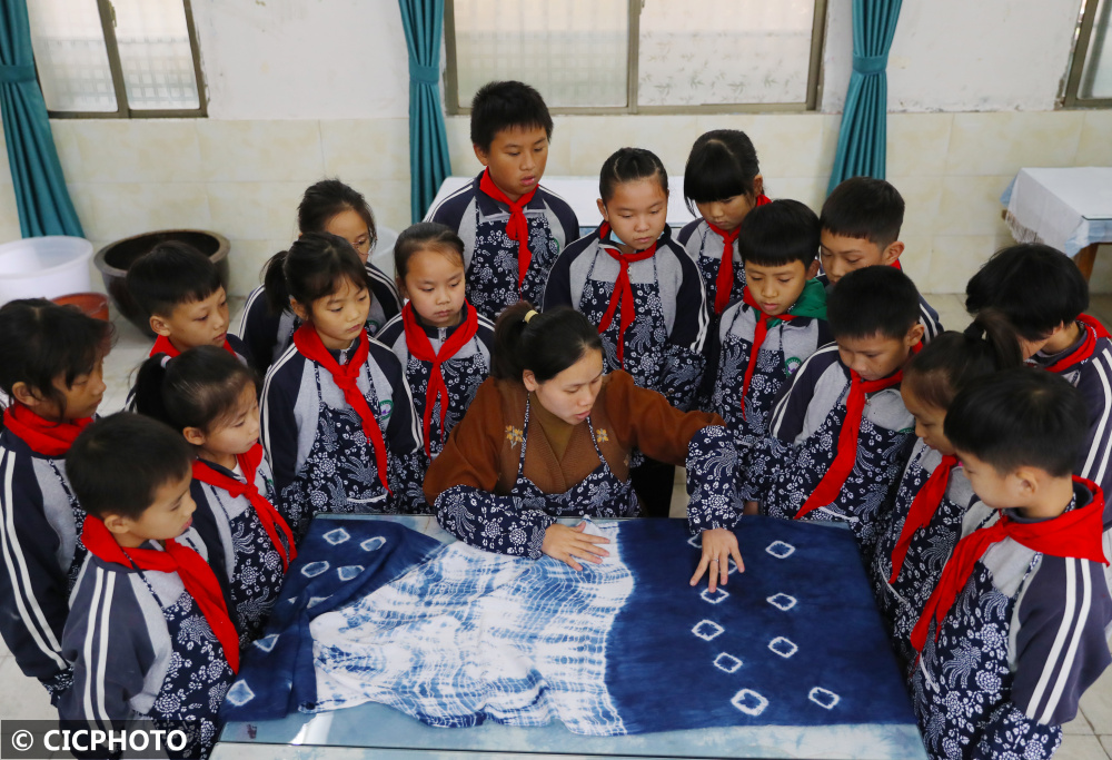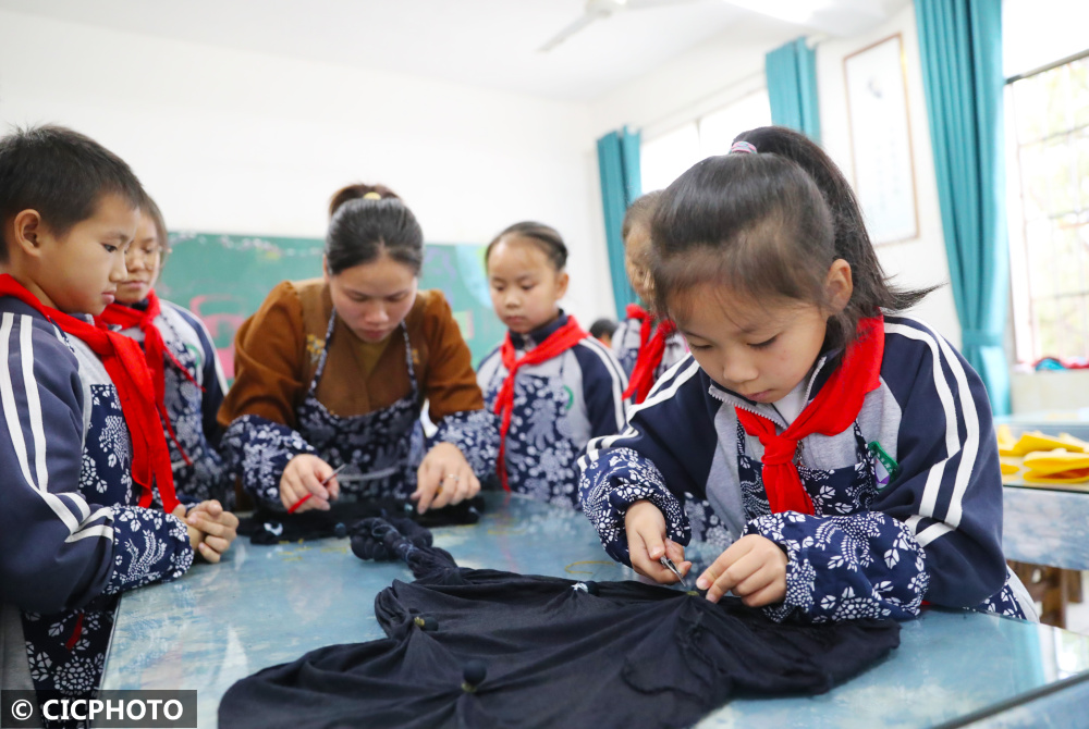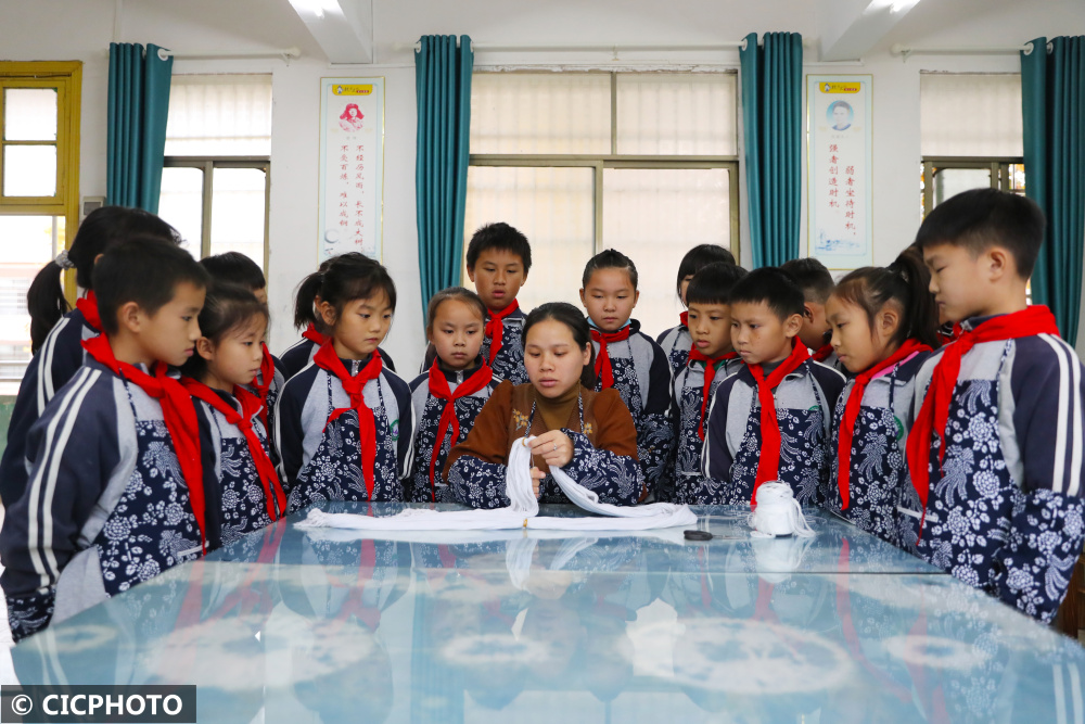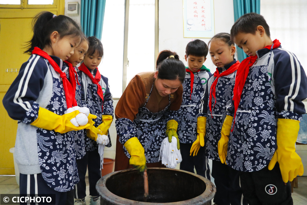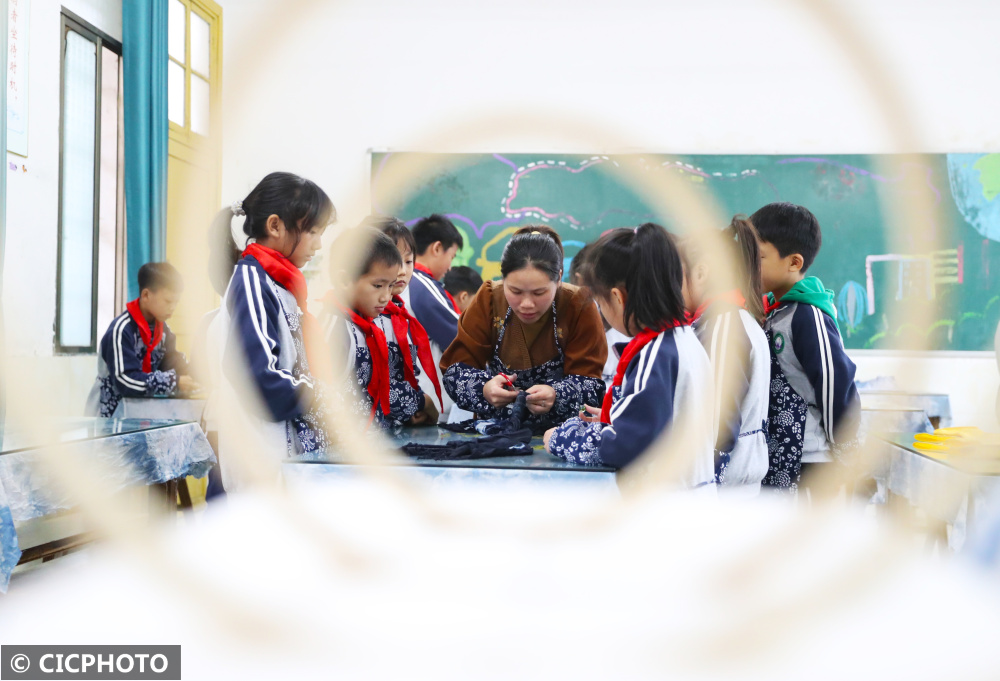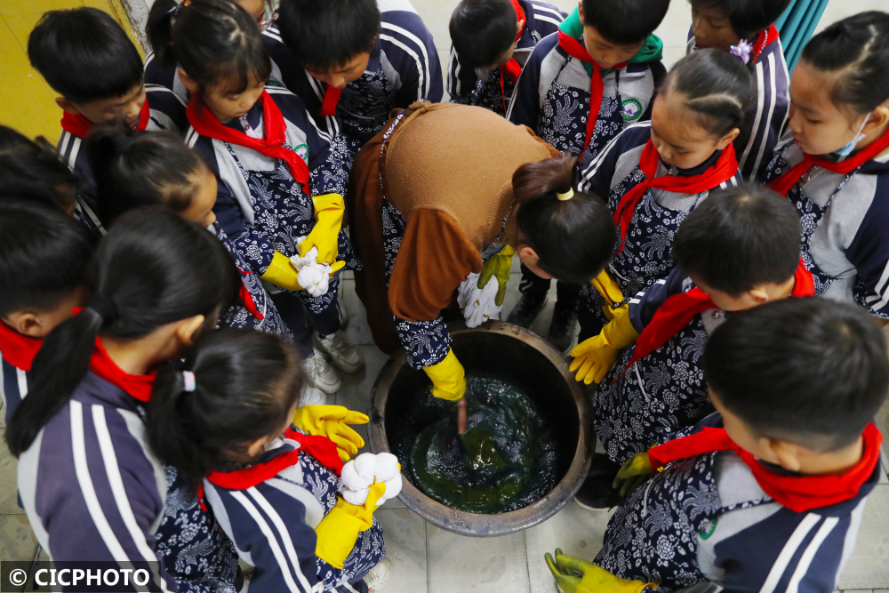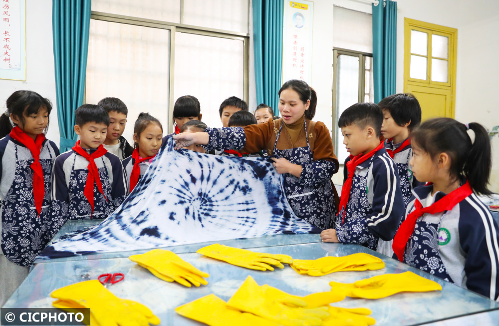 以上图片:2022年11月14日,湖南省永州市新田县龙泉五小的学生在老师指导下学习非物质文化遗产扎染的制作技艺。CICPHOTO/刘贵雄 摄