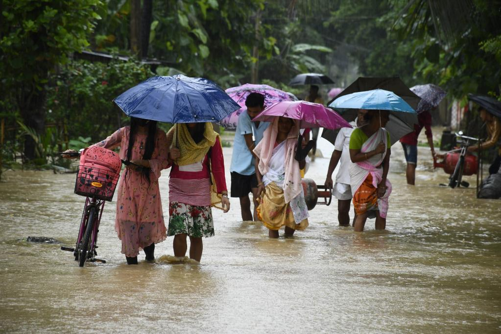 2022年6月17日,在印度阿萨姆邦,人们在洪水中前行。新华社发