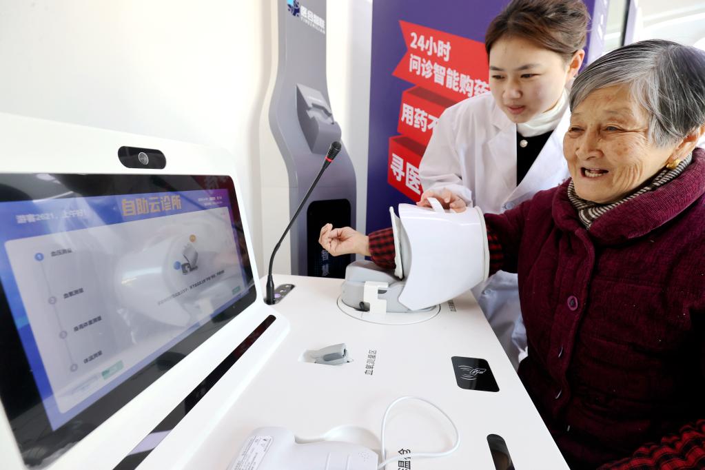 2月16日,在湖州市德清县阜溪街道兴山未来社区居家养老服务中心,家庭医生辅助社区老人进行云问诊。