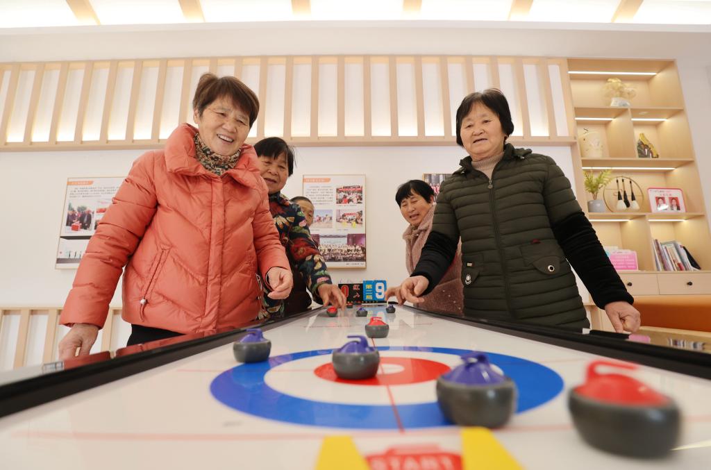2月16日,在湖州市德清县阜溪街道兴山未来社区居家养老服务中心,社区老人在打“桌上冰壶球”。