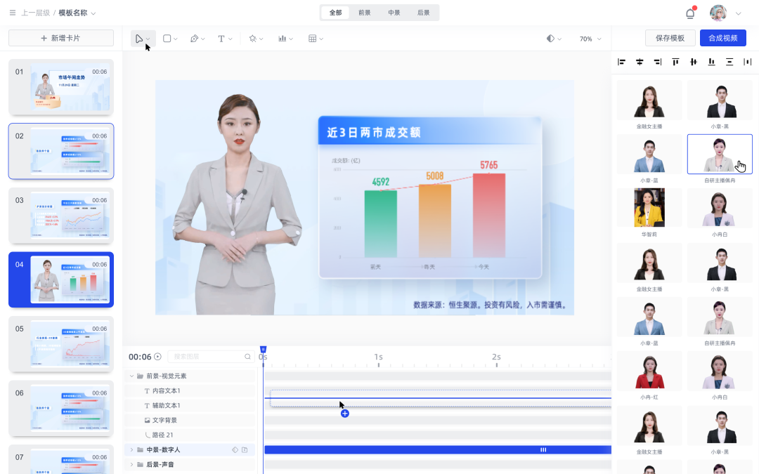 越接近真人外形的数字人,越能提供更亲切、自然、高效的服务体验,让人产生信任。因此,2D仿真类数字人往往适合社交、媒体、金融、电商直播、教育等需要“多交流”“高互动”的场景。数字人可以“扮演”主持人、新闻主播、金融客服、导购员、讲解员、直播博主、老师等角色。在新华智云数字人制作平台中输入文字,一段由数字人播报和讲解的视频,就可以快速生成。