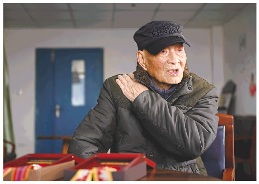 罗锦文老人在浙江省平湖市一家老年康复护理院接受记者采访,摸着右侧肩膀里子弹的位置(3月2日摄)。新华社记者黄宗治摄