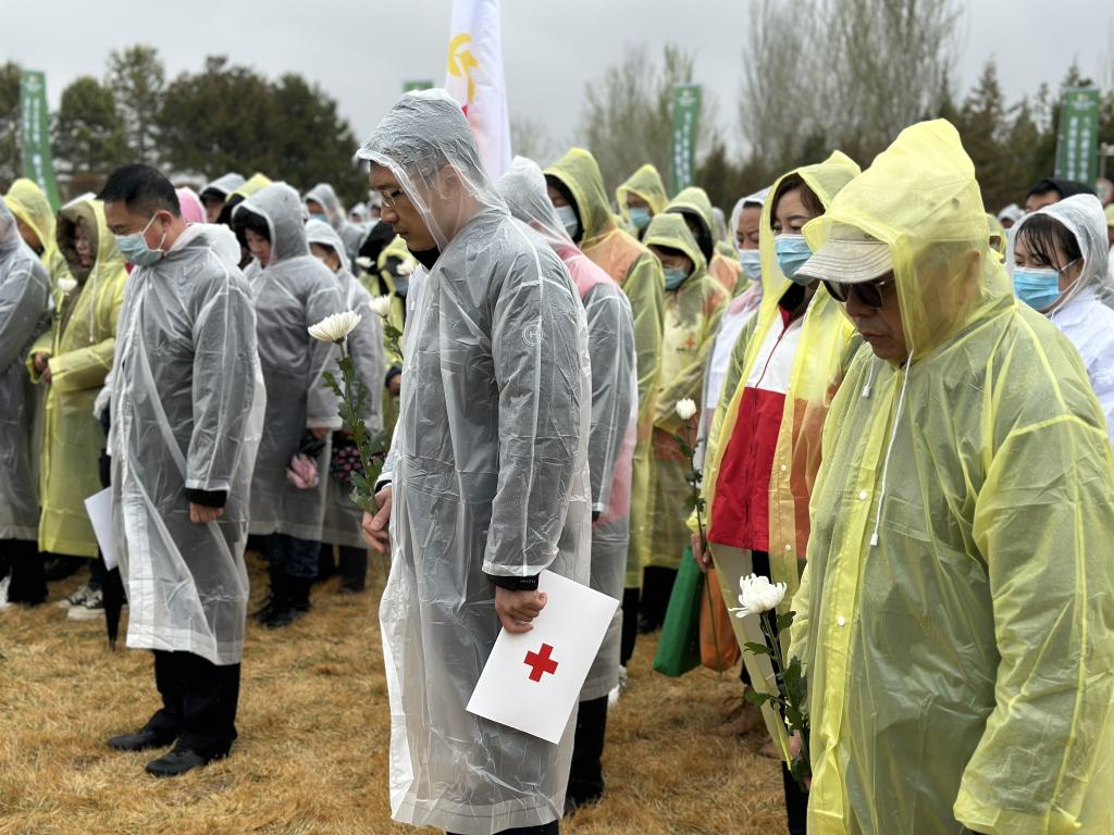 4月4日,宁夏遗体和人体器官捐献纪念园内,人们为捐献者默哀。新华社记者 马丽娟 摄