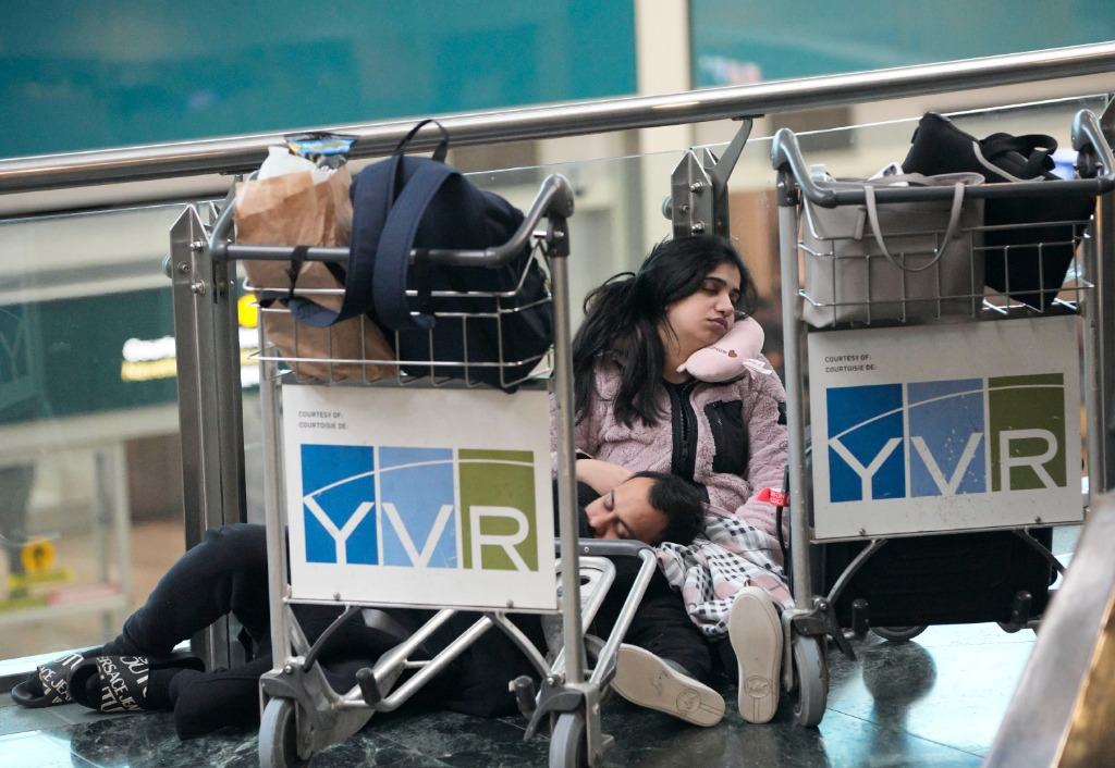 2022年12月20日,滞留旅客在加拿大温哥华国际机场休息。新华社发(梁森摄)