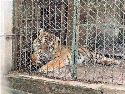 六安市人民公园动物园里的老虎“毛毛”,一天就能吃下二百块钱饲料。