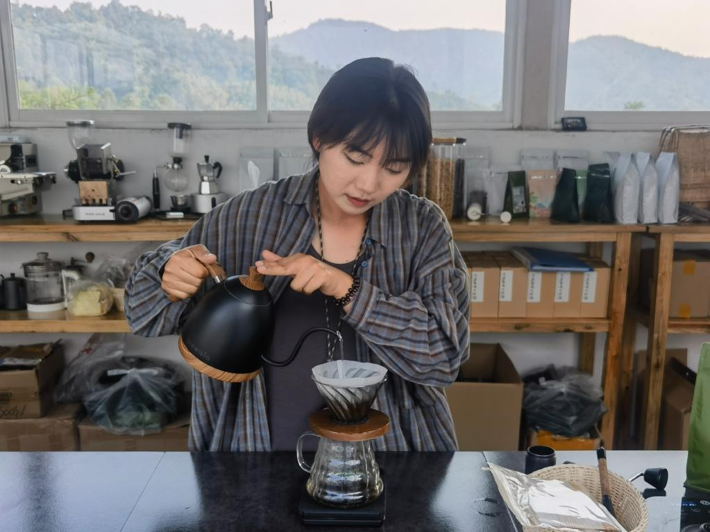4月18日,27岁的中央民族大学博士生杨卓青在云南普洱市野鸭塘河谷咖啡庄园冲泡咖啡。新华社发