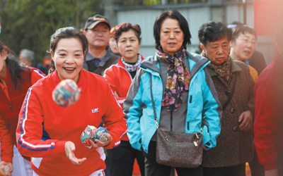 湖北省襄阳市老年大学运动会上,运动员在进行投沙包比赛。杨 东摄(影像中国)