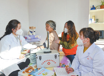 甘肃省定西市通渭县义岗川镇东南村,镇村签约医师和驻村干部志愿者一道进村入户为老人进行身体检查。张子斌摄(影像中国)